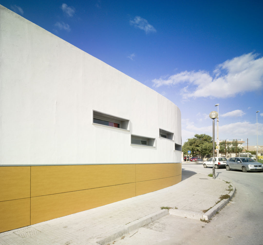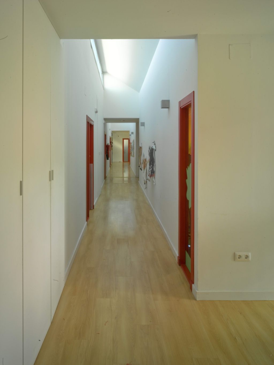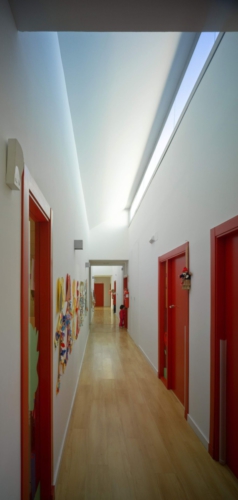 Nos situamos en un solar irregular, con una topografía en ligera pendiente Y con tres de sus cuatro lados dando a vías rodadas. Todo ello ubicado en una zona en regeneración, en la cual, se está pasando de edificaciones dedicadas a almacenaje y venta de materiales, a residencial, predominando las viviendas unifamiliares de una a dos plantas de altura. Con estas premisas y con el uso especial del que se trata, se diseña un edificio de una sola planta en forma de “U”, alineado a dos de las tres vías rodadas y alberga en su interior el patio, orientado al sur y abierto a la otra vía, que es de poco transito, ya que es de acceso a las viviendas ubicadas en la misma y en la actualidad no tiene salida. El acceso se plantea en la esquina, confluencia de las vías rodadas principales, mediante un pequeño patio que permite separar la entrada al centro, de la vía rápida y tener un mejor control de los niños a la hora de la salida y la entrada. Interiormente el acceso se produce por la unión de dos de las alas de la “U”, organizando en su lado mayor las aulas de niños de 1 a 2 años y de 2 a 3 años, divididas por un pasillo central iluminado cenitalmente; el lado menor está ocupado en primera instancia por la parte administrativa y a continuación se disponen las aulas de niños de 0 a 1 año, que requieren condiciones diferentes al resto, accediéndose a éstas mediante una galería acristalada al patio con salida directa al mismo, disponiendo además de una parte acotada para este tipo de niños.