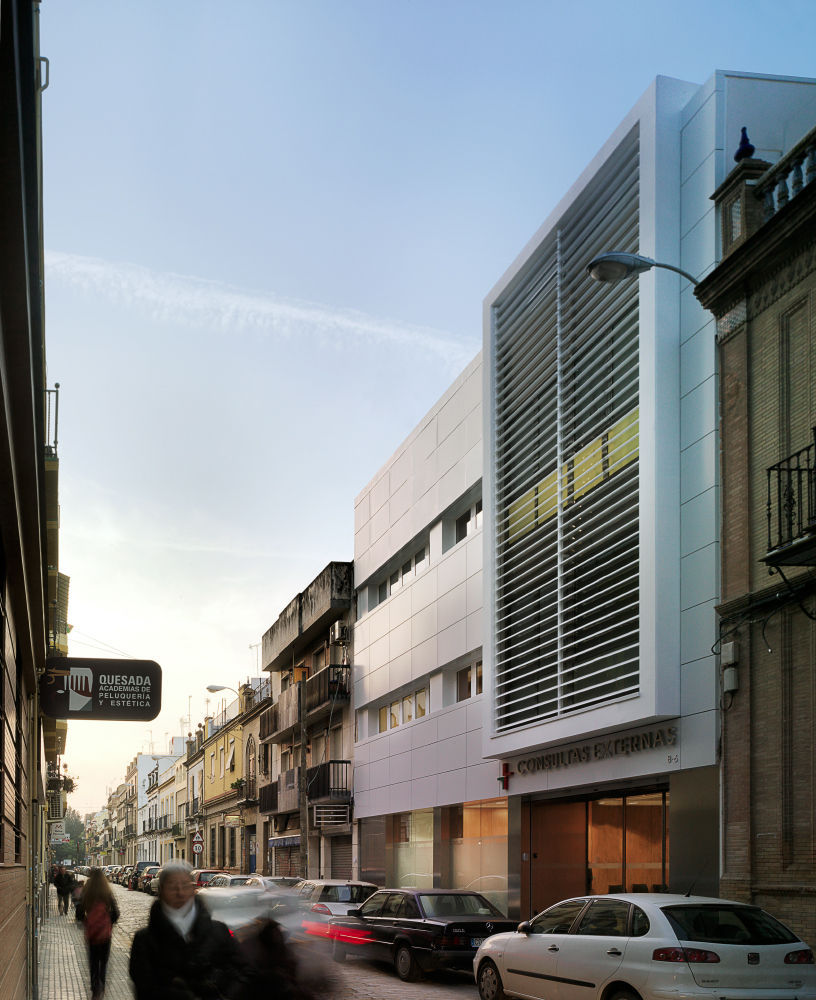 El proyecto consiste en un edificio de tres plantas y sótano destinado a consultas médicas como extensión del Hospital Infanta Luisa. Las ordenanzas obligaban a dejar libre un patio en el fondo de la parcela, que se decide deprimir y que permite que la planta de sótano sea utilizada como una más. La organización de la planta tipo es muy sencilla, con cuatro consultas situadas en las cuatro esquinas dos hacia la fachada y dos hacia el patio, disponiendo entre ellas de forma longitudinal la sala de espera y en sentido transversal las comunicaciones y los aseos. Formalmente el edificio pretende ser un eco del Hospital Infanta Luisa para que sea reconocido como parte de él, utilizando los mismos paneles de aluminio en la fachada, en la que resalta un cuerpo de hormigón visto con una celosía de lamas que señala el acceso principal y al que se confía la singularidad que un edificio de estas características debe tener.