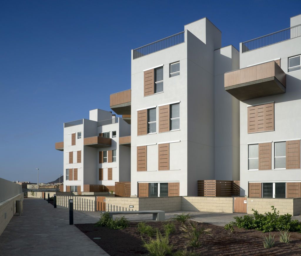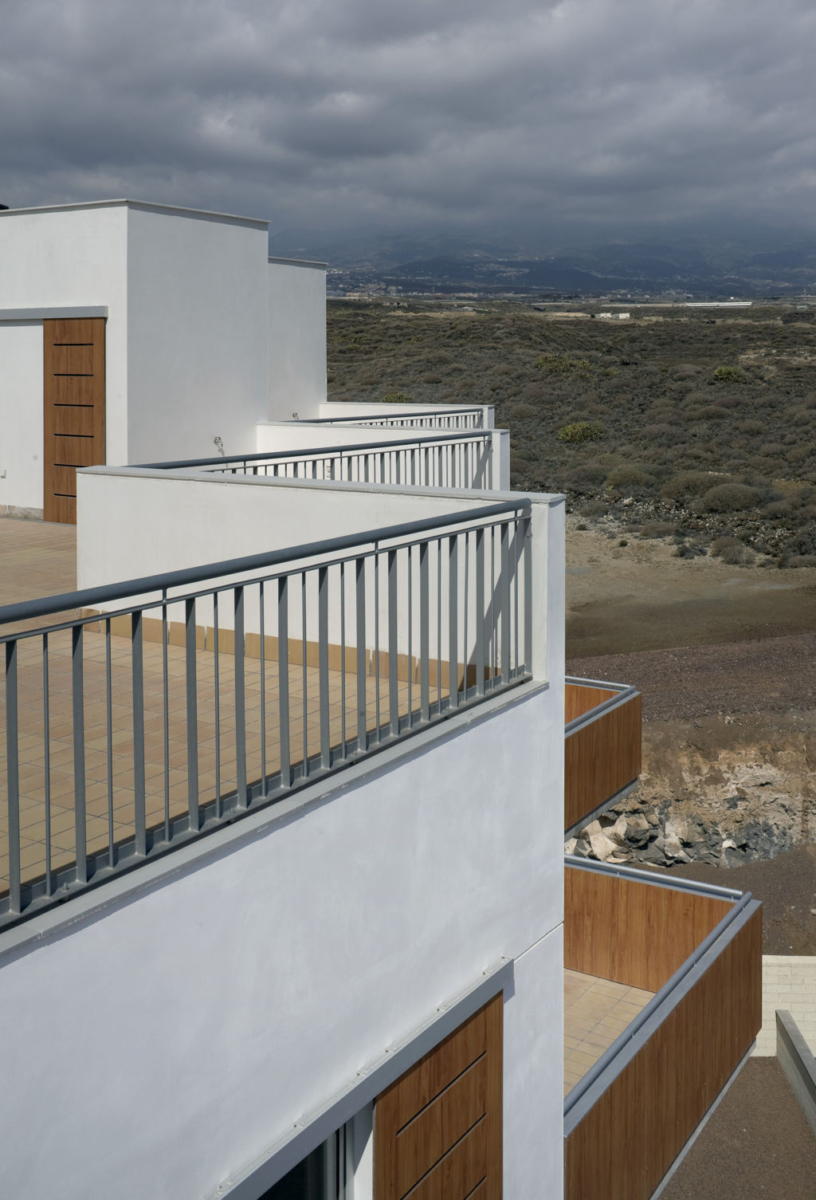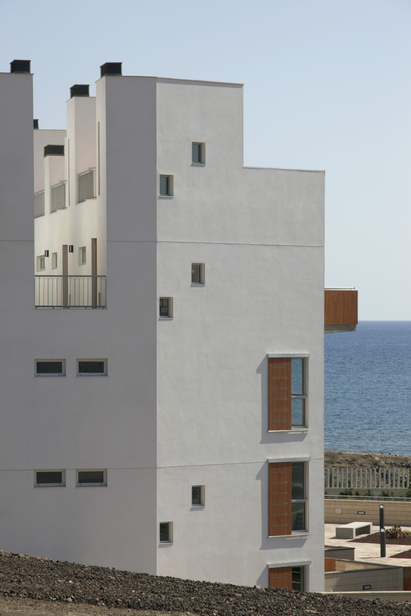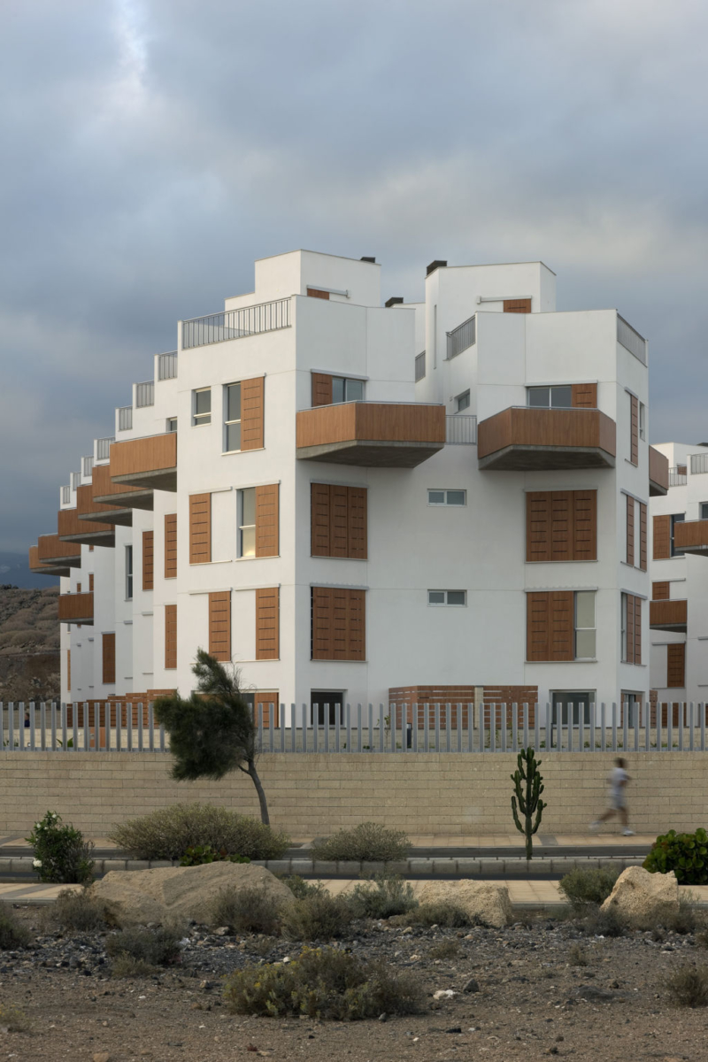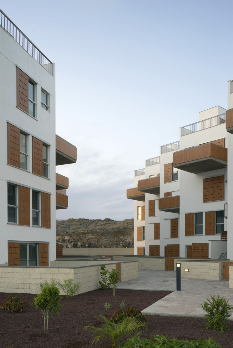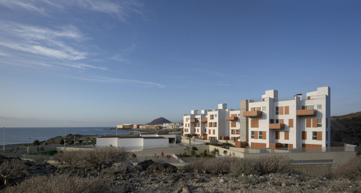 El proyecto se ubica en una parcela de nueva creación situada en el sur de la isla de Tenerife, sus características condicionan el diseño de la siguiente forma: En primer lugar, aunque presenta una forma no demasiado irregular, la afección por parte de la servidumbre de protección de costas, que obliga a situar la edificación residencial por detrás de esta línea, reduce considerablemente el área de movimiento de la edificación y limita las posibilidades de implantación de la propuesta. Otro condicionante es el viento dominante en la zona, que sopla en dirección suroeste y al que la parcela se encuentra especialmente expuesto al encontrarse en primera línea de playa. Por último, su situación privilegiada, junto con el soleamiento, serán determinantes en la forma y orientación de la edificación. Con estas premisas, se proyectan seis bloques aislados, paralelos entre sí, de longitudes variables para no sobrepasar en ningún caso la línea de servidumbre marítimo terrestre. La orientación, además de favorecer las vistas, permite que el impacto visual desde la playa de la Jaquita, situada frente a la edificación, sea menor. Además, al estar dispuestos perpendicularmente a la dirección del viento dominante, los bloques se protegen unos a otros. Las edificaciones tienen cuatro plantas de altura, y están formados por módulos compuestos por dos viviendas dúplex superpuestas, ambas de dos dormitorios, que se agrupan en espiga, con lo que se consigue que todas las viviendas tengan vistas hacia el mar. En determinados casos, y con el fin de obtener viviendas de uno y tres dormitorios, se agrupan tres de estos módulos en las plantas segunda y tercera completado el número de viviendas que asciende a 104. A los dúplex inferiores se accede desde la planta baja, a través de un jardín privativo situado en la parte delantera. Todas estas viviendas cuentan con un garaje individual en planta sótano, compuesto por dos plazas y separado del resto del aparcamiento por una puerta al que se accede por una escalera situada en el interior de la vivienda. A los dúplex superiores se accede a través una galería general descubierta en planta tercera. Estas viviendas, en dicha planta, cuentan con unas grandes terrazas voladas que buscan vistas hacia el mar, estando situados los dormitorios en la planta inferior. Además cuentan con una cubierta transitable, a la que se accede a través de un castillete. La parcela también tiene asignados 850 m2 de edificación dedicada a usos complementarios, de los que se agotan únicamente 500 m2. La normativa permite situar estos usos en zona de servidumbre de protección, por lo que se decide ubicar las edificaciones correspondientes a estos usos de forma independiente en el extremo este de la parcela. Se disponen dos edificios que conforman una plaza entre ellos, que dada su disposición, se encuentra a resguardo del viento. Cuenta con acceso desde la avenida marítima y está por tanto, muy enfocada a usos relacionados con la playa. Además el conjunto residencial dispone de amplias zonas ajardinadas, de una pista deportiva y de zona de piscina, todas ellas resguardadas del viento y con vistas al mar. El programa se completa con una planta bajo rasante que alberga 196 plazas de aparcamiento, de las cuales 104 se encuentran cerradas en grupos de dos en comunicación directa con las viviendas de planta baja.. Formalmente el conjunto se resuelve combinando enfoscados con aplacados de piedra del lugar denominada canto blanco del sur en zócalos y pretiles de planta baja, y tablero fenólico para el forrado de pretiles de balcones y contraventanas, todo ello completado con zonas ajardinadas.