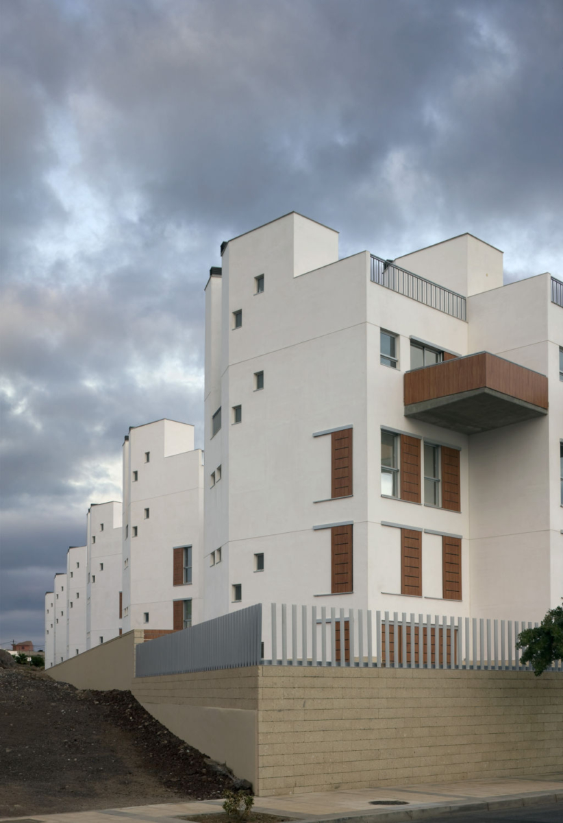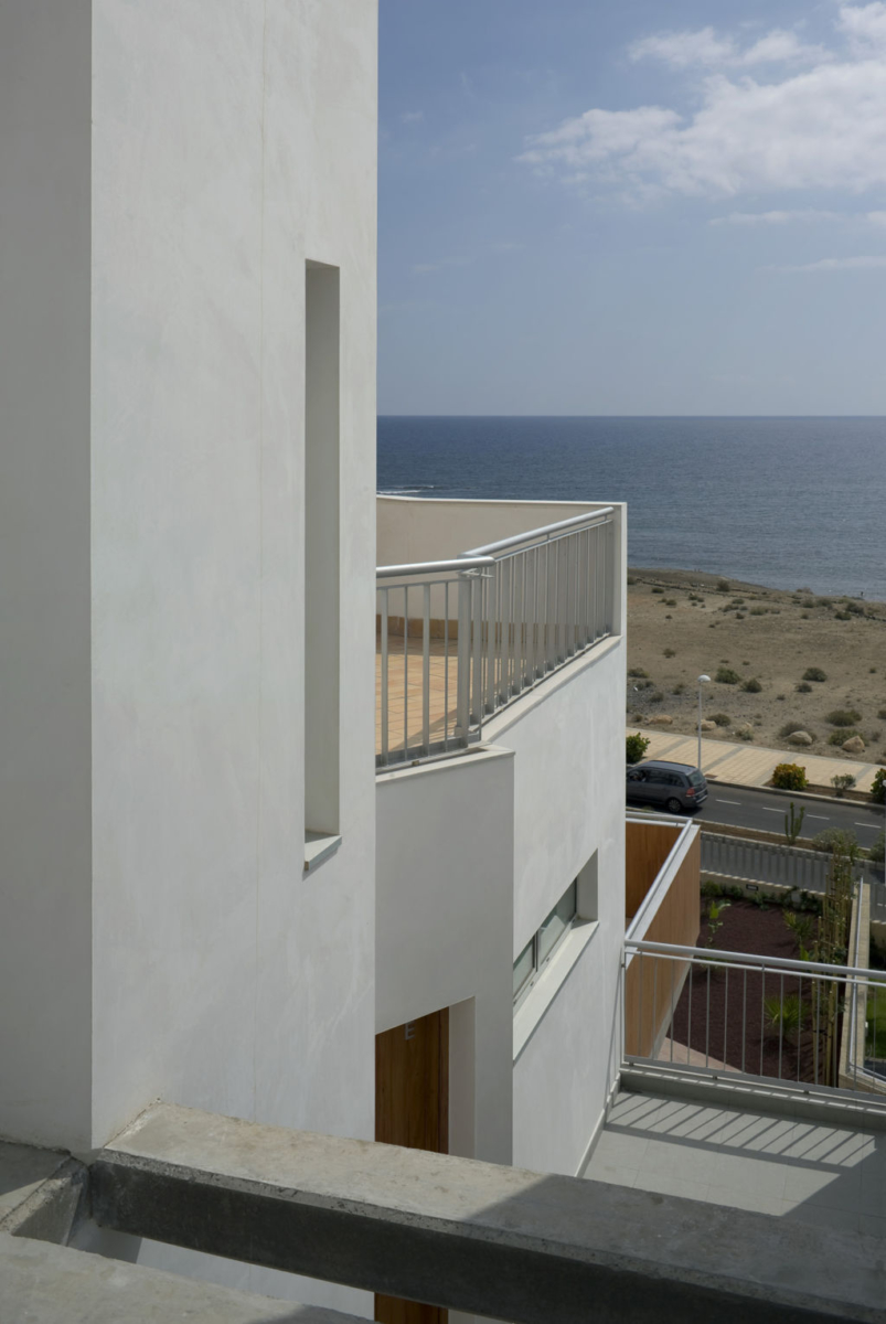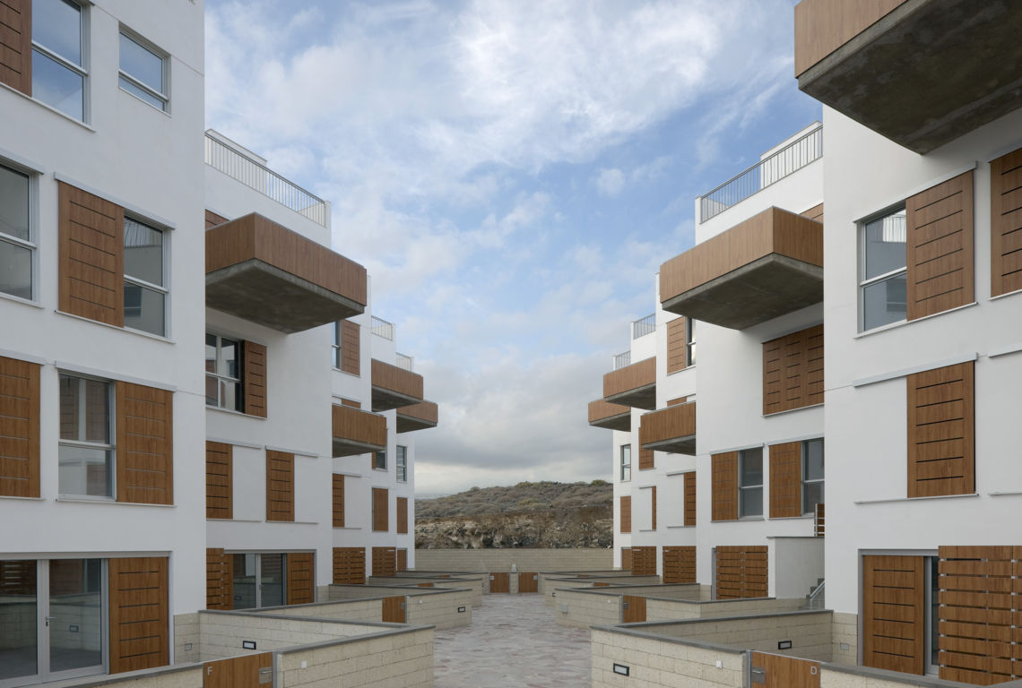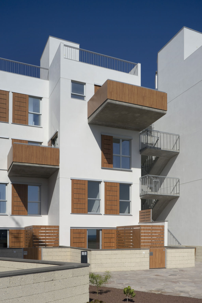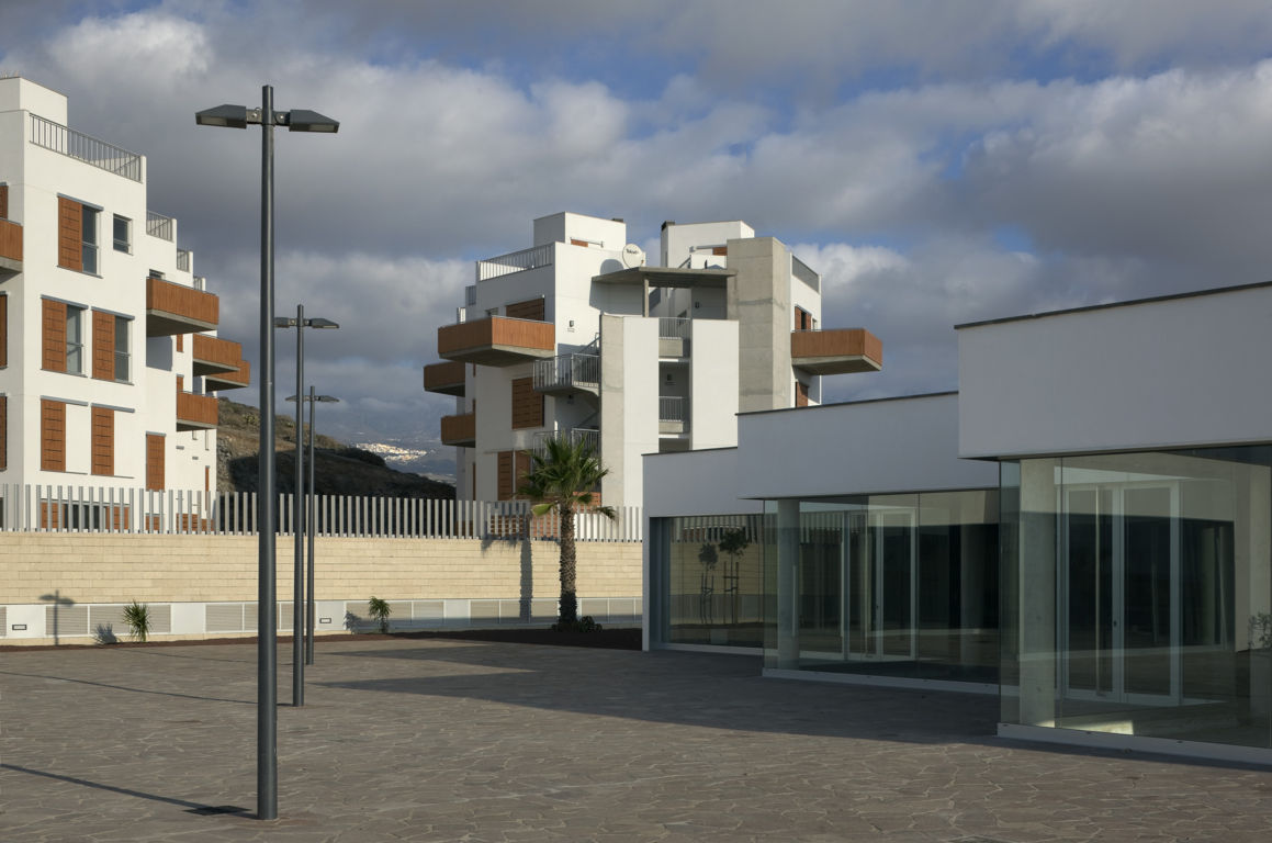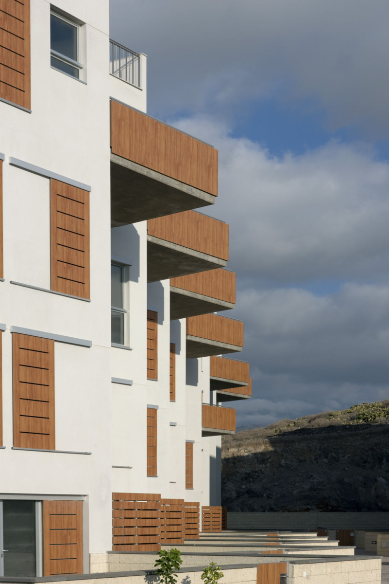 El proyecto se ubica en una parcela de nueva creación situada en el sur de la isla de Tenerife, sus características condicionan el diseño de la siguiente forma: En primer lugar, aunque presenta una forma no demasiado irregular, la afección por parte de la servidumbre de protección de costas, que obliga a situar la edificación residencial por detrás de esta línea, reduce considerablemente el área de movimiento de la edificación y limita las posibilidades de implantación de la propuesta. Otro condicionante es el viento dominante en la zona, que sopla en dirección suroeste y al que la parcela se encuentra especialmente expuesto al encontrarse en primera línea de playa. Por último, su situación privilegiada, junto con el soleamiento, serán determinantes en la forma y orientación de la edificación. Con estas premisas, se proyectan seis bloques aislados, paralelos entre sí, de longitudes variables para no sobrepasar en ningún caso la línea de servidumbre marítimo terrestre. La orientación, además de favorecer las vistas, permite que el impacto visual desde la playa de la Jaquita, situada frente a la edificación, sea menor. Además, al estar dispuestos perpendicularmente a la dirección del viento dominante, los bloques se protegen unos a otros. Las edificaciones tienen cuatro plantas de altura, y están formados por módulos compuestos por dos viviendas dúplex superpuestas, ambas de dos dormitorios, que se agrupan en espiga, con lo que se consigue que todas las viviendas tengan vistas hacia el mar. En determinados casos, y con el fin de obtener viviendas de uno y tres dormitorios, se agrupan tres de estos módulos en las plantas segunda y tercera completado el número de viviendas que asciende a 104. A los dúplex inferiores se accede desde la planta baja, a través de un jardín privativo situado en la parte delantera. Todas estas viviendas cuentan con un garaje individual en planta sótano, compuesto por dos plazas y separado del resto del aparcamiento por una puerta al que se accede por una escalera situada en el interior de la vivienda. A los dúplex superiores se accede a través una galería general descubierta en planta tercera. Estas viviendas, en dicha planta, cuentan con unas grandes terrazas voladas que buscan vistas hacia el mar, estando situados los dormitorios en la planta inferior. Además cuentan con una cubierta transitable, a la que se accede a través de un castillete. La parcela también tiene asignados 850 m2 de edificación dedicada a usos complementarios, de los que se agotan únicamente 500 m2. La normativa permite situar estos usos en zona de servidumbre de protección, por lo que se decide ubicar las edificaciones correspondientes a estos usos de forma independiente en el extremo este de la parcela. Se disponen dos edificios que conforman una plaza entre ellos, que dada su disposición, se encuentra a resguardo del viento. Cuenta con acceso desde la avenida marítima y está por tanto, muy enfocada a usos relacionados con la playa. Además el conjunto residencial dispone de amplias zonas ajardinadas, de una pista deportiva y de zona de piscina, todas ellas resguardadas del viento y con vistas al mar. El programa se completa con una planta bajo rasante que alberga 196 plazas de aparcamiento, de las cuales 104 se encuentran cerradas en grupos de dos en comunicación directa con las viviendas de planta baja.. Formalmente el conjunto se resuelve combinando enfoscados con aplacados de piedra del lugar denominada canto blanco del sur en zócalos y pretiles de planta baja, y tablero fenólico para el forrado de pretiles de balcones y contraventanas, todo ello completado con zonas ajardinadas.