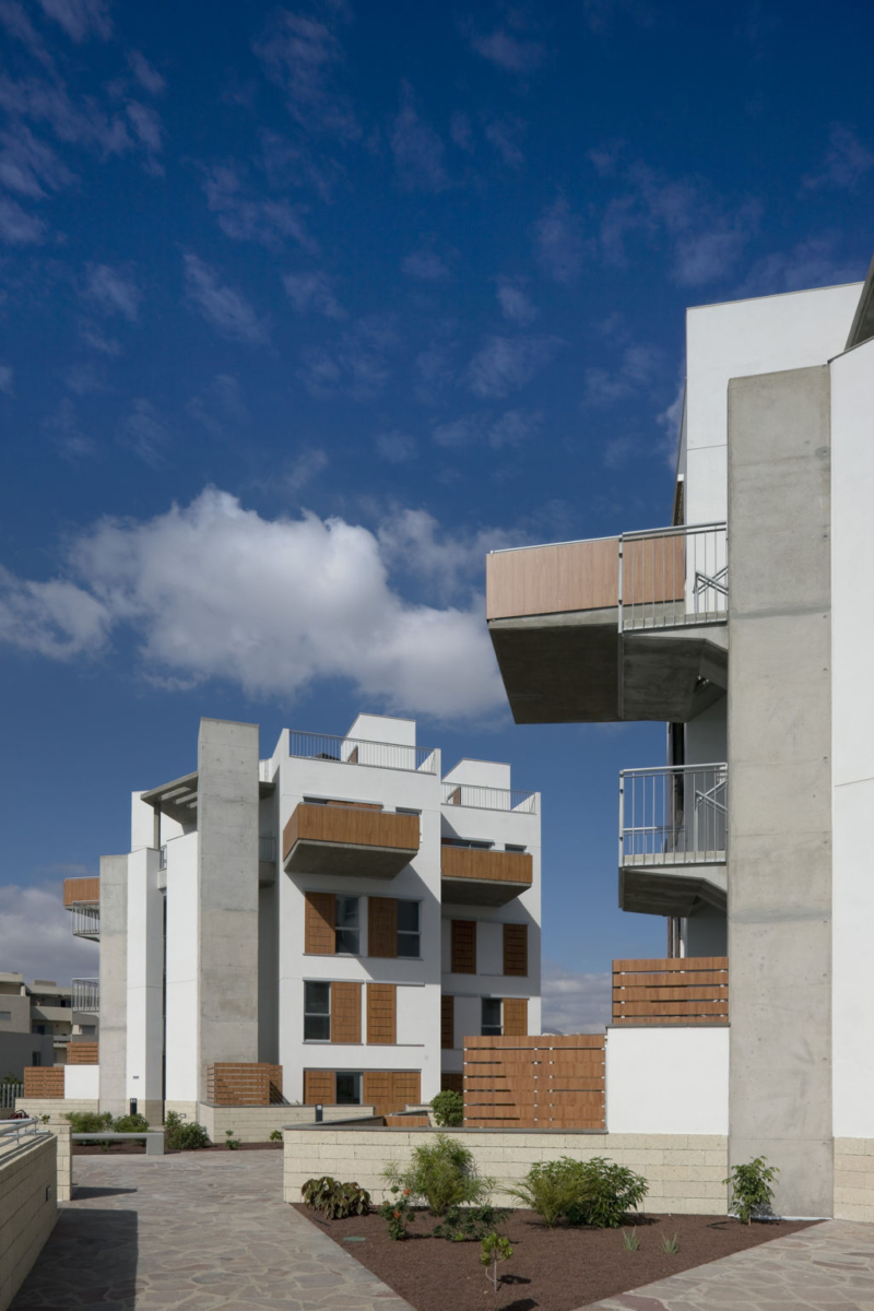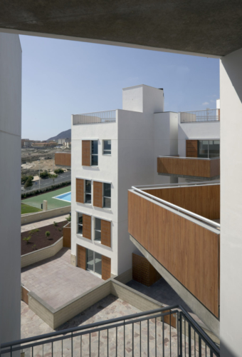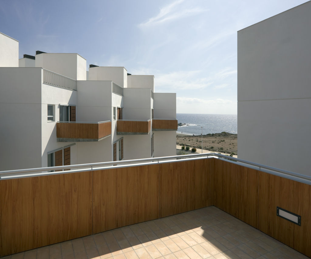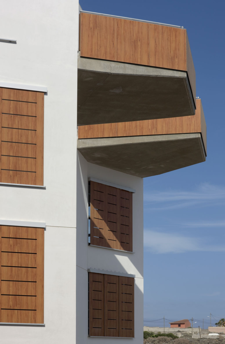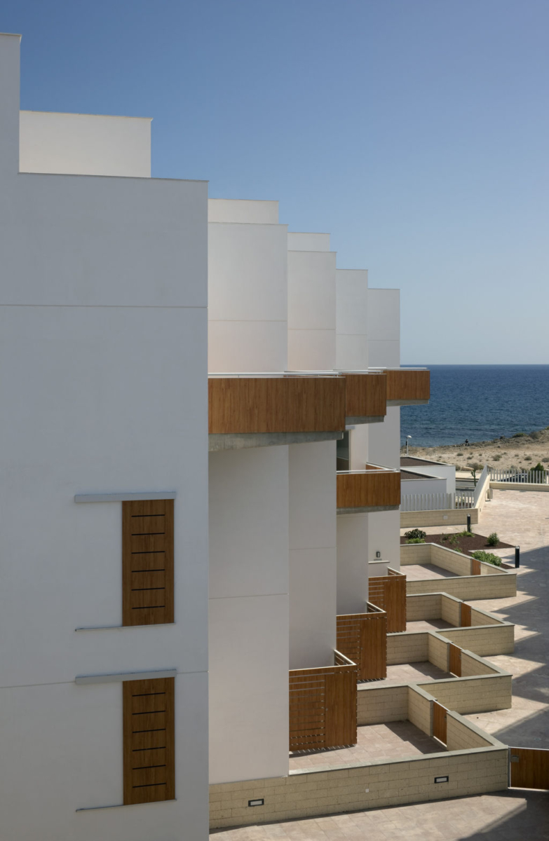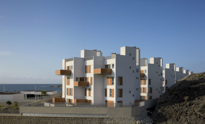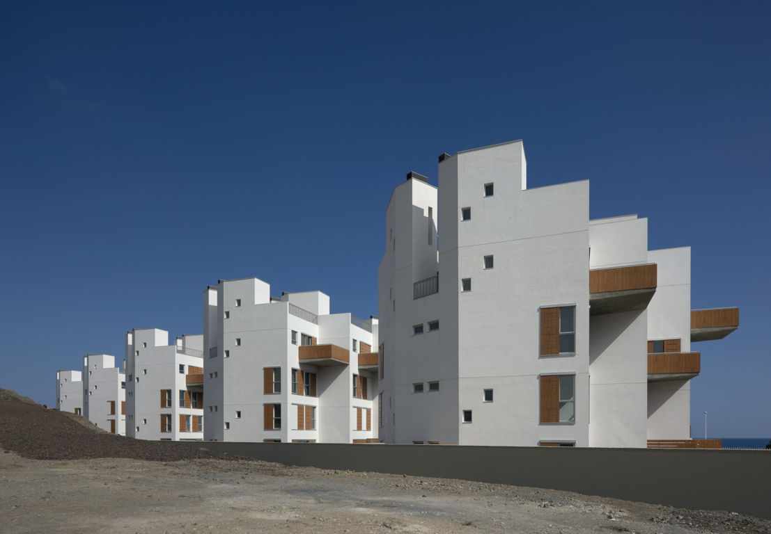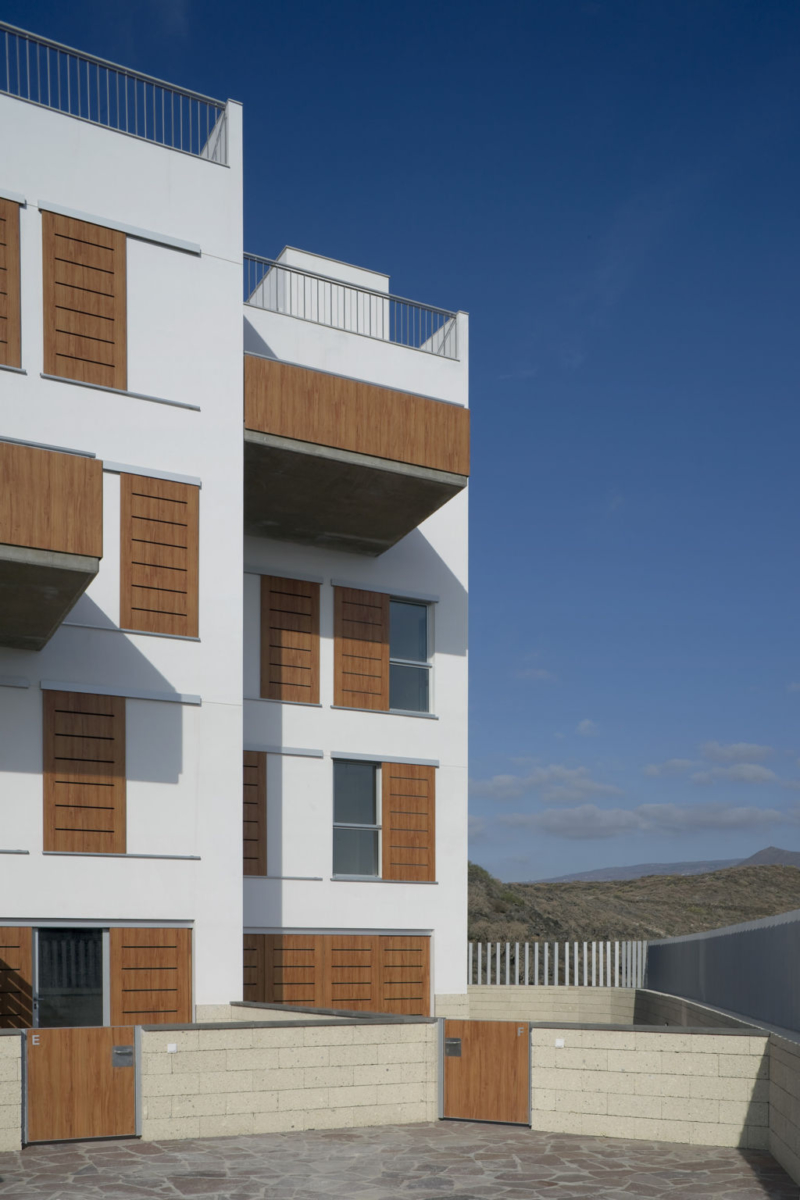 El proyecto se ubica en una parcela de nueva creación situada en el sur de la isla de Tenerife, sus características condicionan el diseño de la siguiente forma: En primer lugar, aunque presenta una forma no demasiado irregular, la afección por parte de la servidumbre de protección de costas, que obliga a situar la edificación residencial por detrás de esta línea, reduce considerablemente el área de movimiento de la edificación y limita las posibilidades de implantación de la propuesta. Otro condicionante es el viento dominante en la zona, que sopla en dirección suroeste y al que la parcela se encuentra especialmente expuesto al encontrarse en primera línea de playa. Por último, su situación privilegiada, junto con el soleamiento, serán determinantes en la forma y orientación de la edificación. Con estas premisas, se proyectan seis bloques aislados, paralelos entre sí, de longitudes variables para no sobrepasar en ningún caso la línea de servidumbre marítimo terrestre. La orientación, además de favorecer las vistas, permite que el impacto visual desde la playa de la Jaquita, situada frente a la edificación, sea menor. Además, al estar dispuestos perpendicularmente a la dirección del viento dominante, los bloques se protegen unos a otros. Las edificaciones tienen cuatro plantas de altura, y están formados por módulos compuestos por dos viviendas dúplex superpuestas, ambas de dos dormitorios, que se agrupan en espiga, con lo que se consigue que todas las viviendas tengan vistas hacia el mar. En determinados casos, y con el fin de obtener viviendas de uno y tres dormitorios, se agrupan tres de estos módulos en las plantas segunda y tercera completado el número de viviendas que asciende a 104. A los dúplex inferiores se accede desde la planta baja, a través de un jardín privativo situado en la parte delantera. Todas estas viviendas cuentan con un garaje individual en planta sótano, compuesto por dos plazas y separado del resto del aparcamiento por una puerta al que se accede por una escalera situada en el interior de la vivienda. A los dúplex superiores se accede a través una galería general descubierta en planta tercera. Estas viviendas, en dicha planta, cuentan con unas grandes terrazas voladas que buscan vistas hacia el mar, estando situados los dormitorios en la planta inferior. Además cuentan con una cubierta transitable, a la que se accede a través de un castillete. La parcela también tiene asignados 850 m2 de edificación dedicada a usos complementarios, de los que se agotan únicamente 500 m2. La normativa permite situar estos usos en zona de servidumbre de protección, por lo que se decide ubicar las edificaciones correspondientes a estos usos de forma independiente en el extremo este de la parcela. Se disponen dos edificios que conforman una plaza entre ellos, que dada su disposición, se encuentra a resguardo del viento. Cuenta con acceso desde la avenida marítima y está por tanto, muy enfocada a usos relacionados con la playa. Además el conjunto residencial dispone de amplias zonas ajardinadas, de una pista deportiva y de zona de piscina, todas ellas resguardadas del viento y con vistas al mar. El programa se completa con una planta bajo rasante que alberga 196 plazas de aparcamiento, de las cuales 104 se encuentran cerradas en grupos de dos en comunicación directa con las viviendas de planta baja.. Formalmente el conjunto se resuelve combinando enfoscados con aplacados de piedra del lugar denominada canto blanco del sur en zócalos y pretiles de planta baja, y tablero fenólico para el forrado de pretiles de balcones y contraventanas, todo ello completado con zonas ajardinadas.