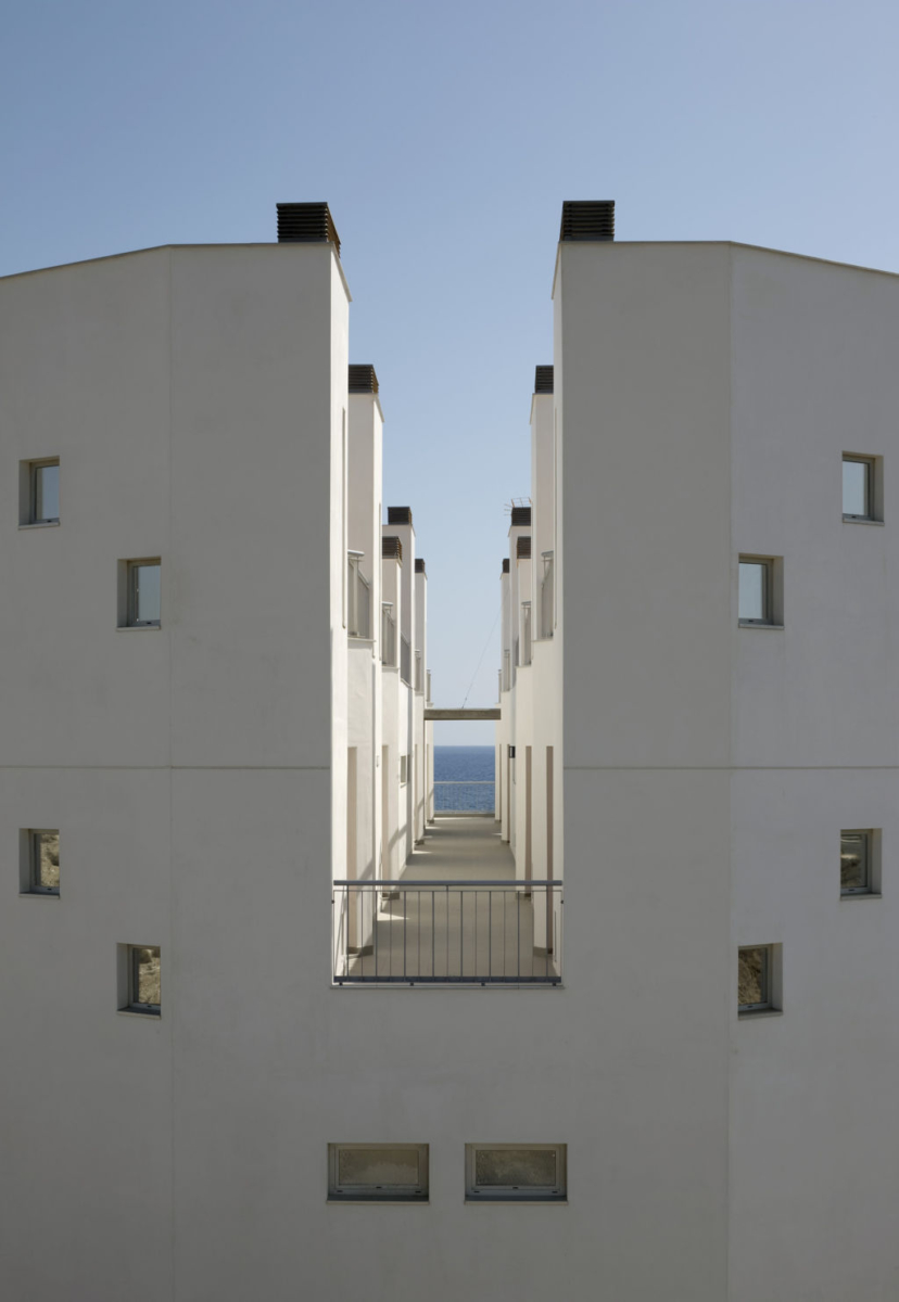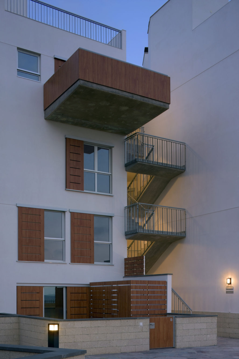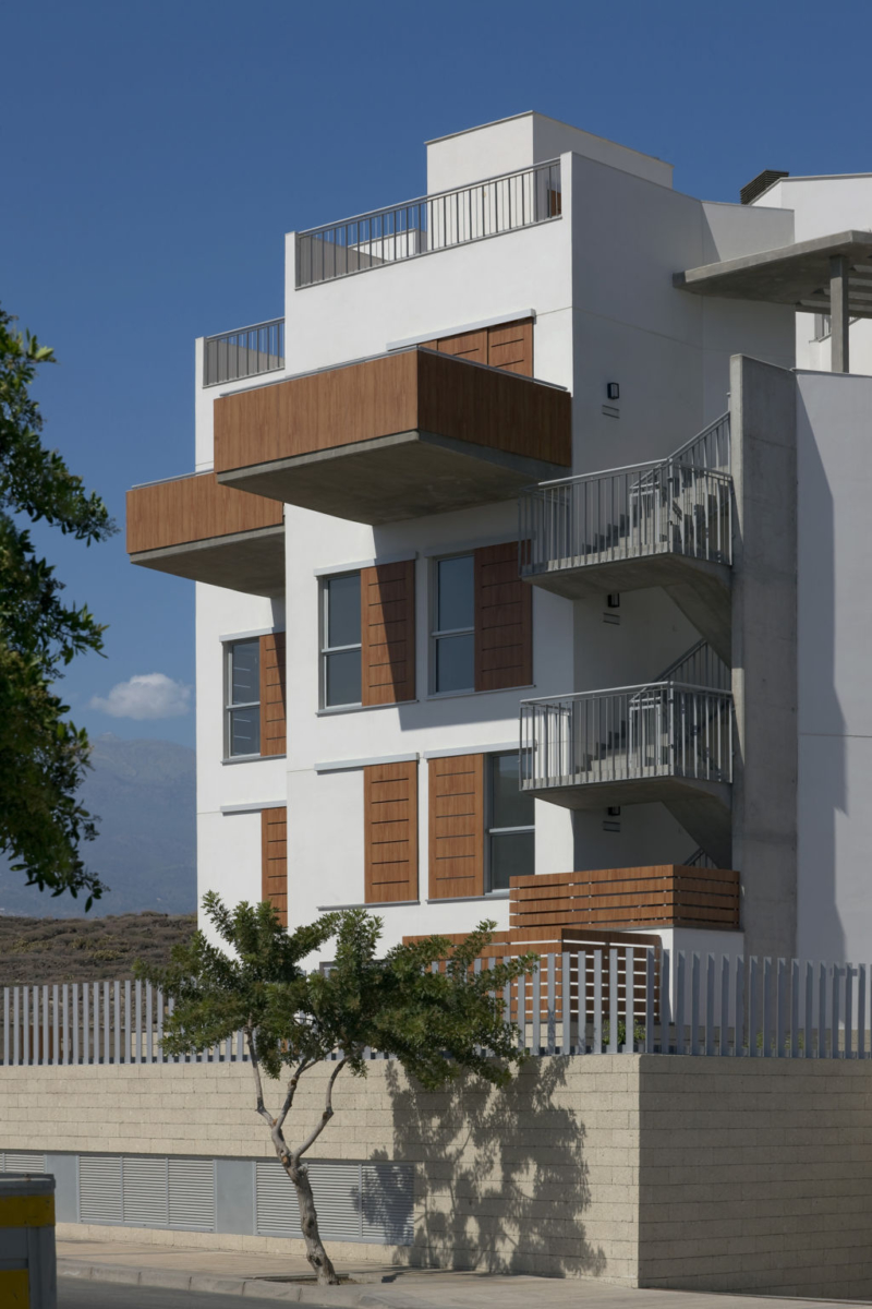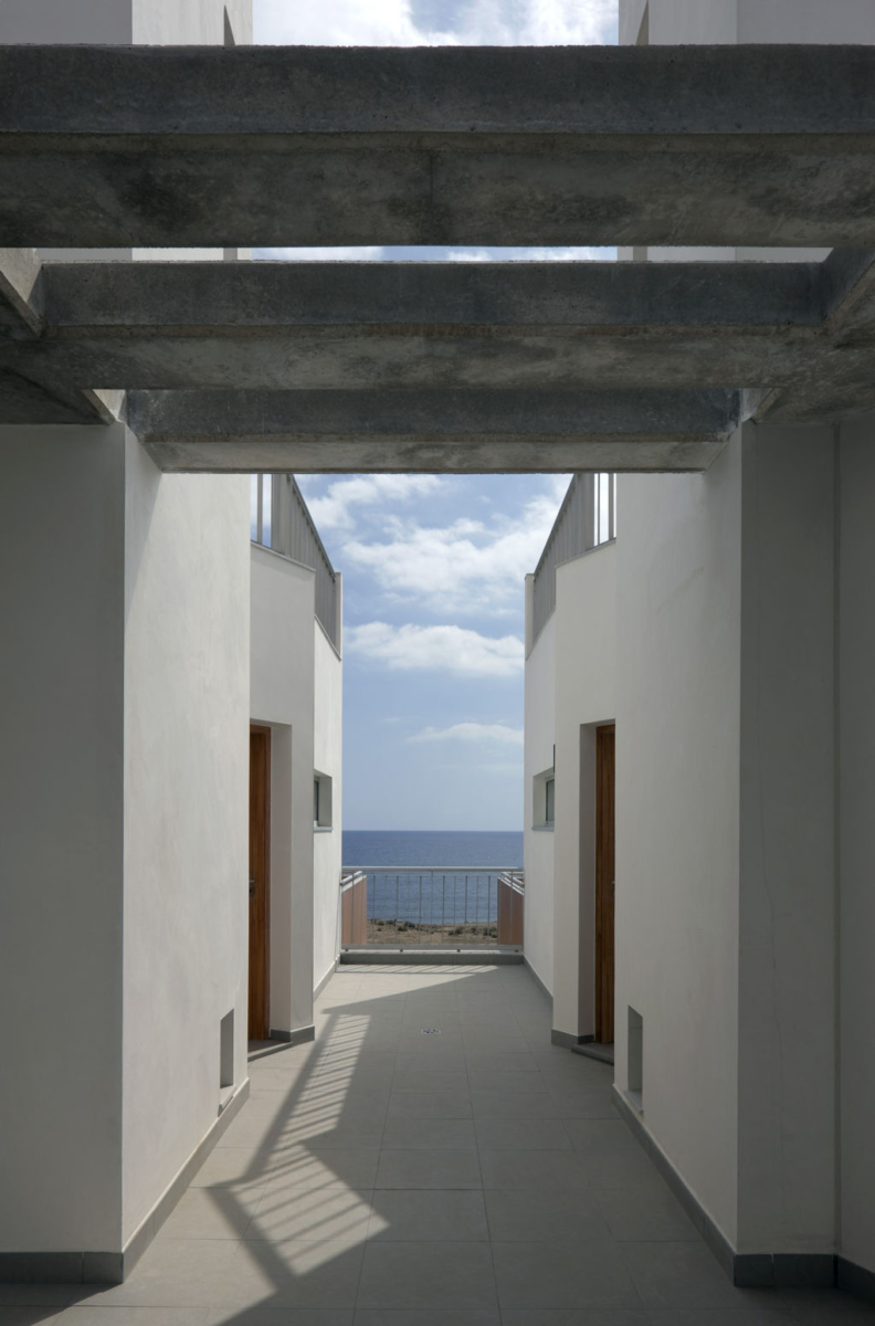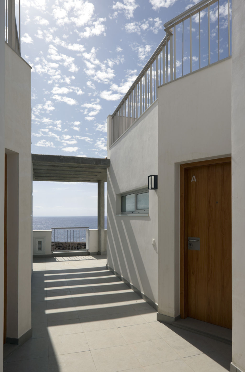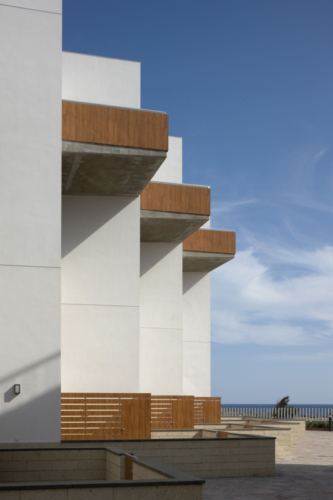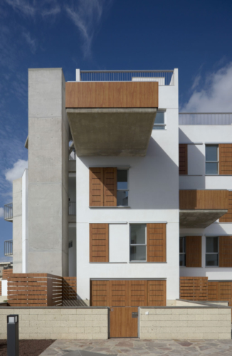 El proyecto se ubica en una parcela de nueva creación situada en el sur de la isla de Tenerife, sus características condicionan el diseño de la siguiente forma: En primer lugar, aunque presenta una forma no demasiado irregular, la afección por parte de la servidumbre de protección de costas, que obliga a situar la edificación residencial por detrás de esta línea, reduce considerablemente el área de movimiento de la edificación y limita las posibilidades de implantación de la propuesta. Otro condicionante es el viento dominante en la zona, que sopla en dirección suroeste y al que la parcela se encuentra especialmente expuesto al encontrarse en primera línea de playa. Por último, su situación privilegiada, junto con el soleamiento, serán determinantes en la forma y orientación de la edificación. Con estas premisas, se proyectan seis bloques aislados, paralelos entre sí, de longitudes variables para no sobrepasar en ningún caso la línea de servidumbre marítimo terrestre. La orientación, además de favorecer las vistas, permite que el impacto visual desde la playa de la Jaquita, situada frente a la edificación, sea menor. Además, al estar dispuestos perpendicularmente a la dirección del viento dominante, los bloques se protegen unos a otros. Las edificaciones tienen cuatro plantas de altura, y están formados por módulos compuestos por dos viviendas dúplex superpuestas, ambas de dos dormitorios, que se agrupan en espiga, con lo que se consigue que todas las viviendas tengan vistas hacia el mar. En determinados casos, y con el fin de obtener viviendas de uno y tres dormitorios, se agrupan tres de estos módulos en las plantas segunda y tercera completado el número de viviendas que asciende a 104. A los dúplex inferiores se accede desde la planta baja, a través de un jardín privativo situado en la parte delantera. Todas estas viviendas cuentan con un garaje individual en planta sótano, compuesto por dos plazas y separado del resto del aparcamiento por una puerta al que se accede por una escalera situada en el interior de la vivienda. A los dúplex superiores se accede a través una galería general descubierta en planta tercera. Estas viviendas, en dicha planta, cuentan con unas grandes terrazas voladas que buscan vistas hacia el mar, estando situados los dormitorios en la planta inferior. Además cuentan con una cubierta transitable, a la que se accede a través de un castillete. La parcela también tiene asignados 850 m2 de edificación dedicada a usos complementarios, de los que se agotan únicamente 500 m2. La normativa permite situar estos usos en zona de servidumbre de protección, por lo que se decide ubicar las edificaciones correspondientes a estos usos de forma independiente en el extremo este de la parcela. Se disponen dos edificios que conforman una plaza entre ellos, que dada su disposición, se encuentra a resguardo del viento. Cuenta con acceso desde la avenida marítima y está por tanto, muy enfocada a usos relacionados con la playa. Además el conjunto residencial dispone de amplias zonas ajardinadas, de una pista deportiva y de zona de piscina, todas ellas resguardadas del viento y con vistas al mar. El programa se completa con una planta bajo rasante que alberga 196 plazas de aparcamiento, de las cuales 104 se encuentran cerradas en grupos de dos en comunicación directa con las viviendas de planta baja.. Formalmente el conjunto se resuelve combinando enfoscados con aplacados de piedra del lugar denominada canto blanco del sur en zócalos y pretiles de planta baja, y tablero fenólico para el forrado de pretiles de balcones y contraventanas, todo ello completado con zonas ajardinadas.